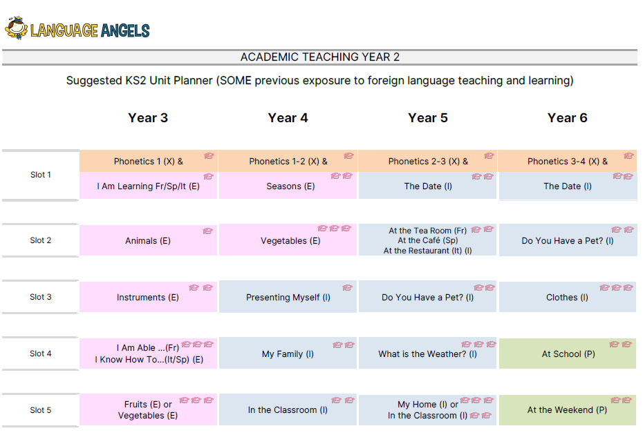 We broadly follow Language Angels to plan and deliver the French curriculum. Below is an overview of the topics KS2 will follow this year.