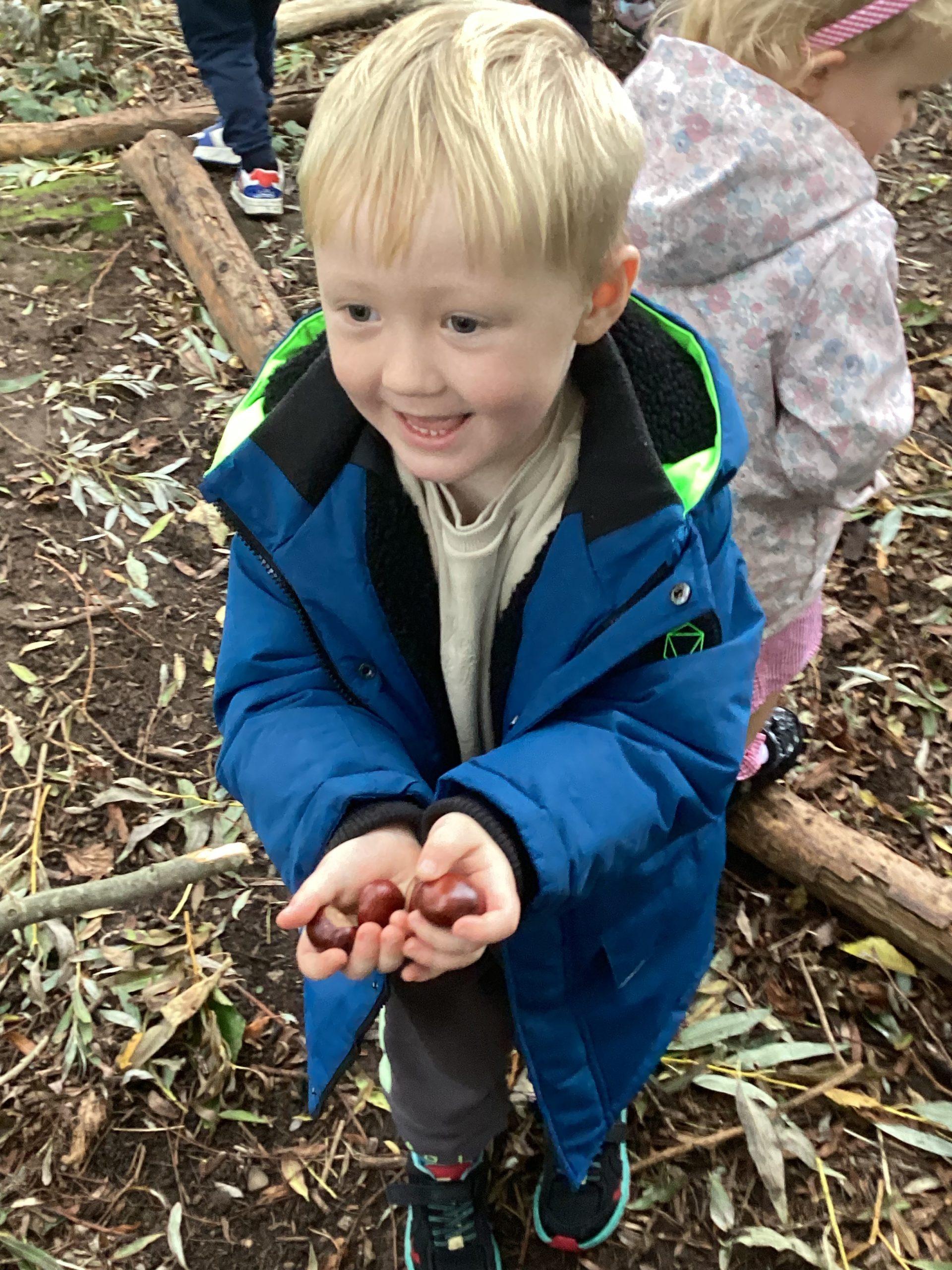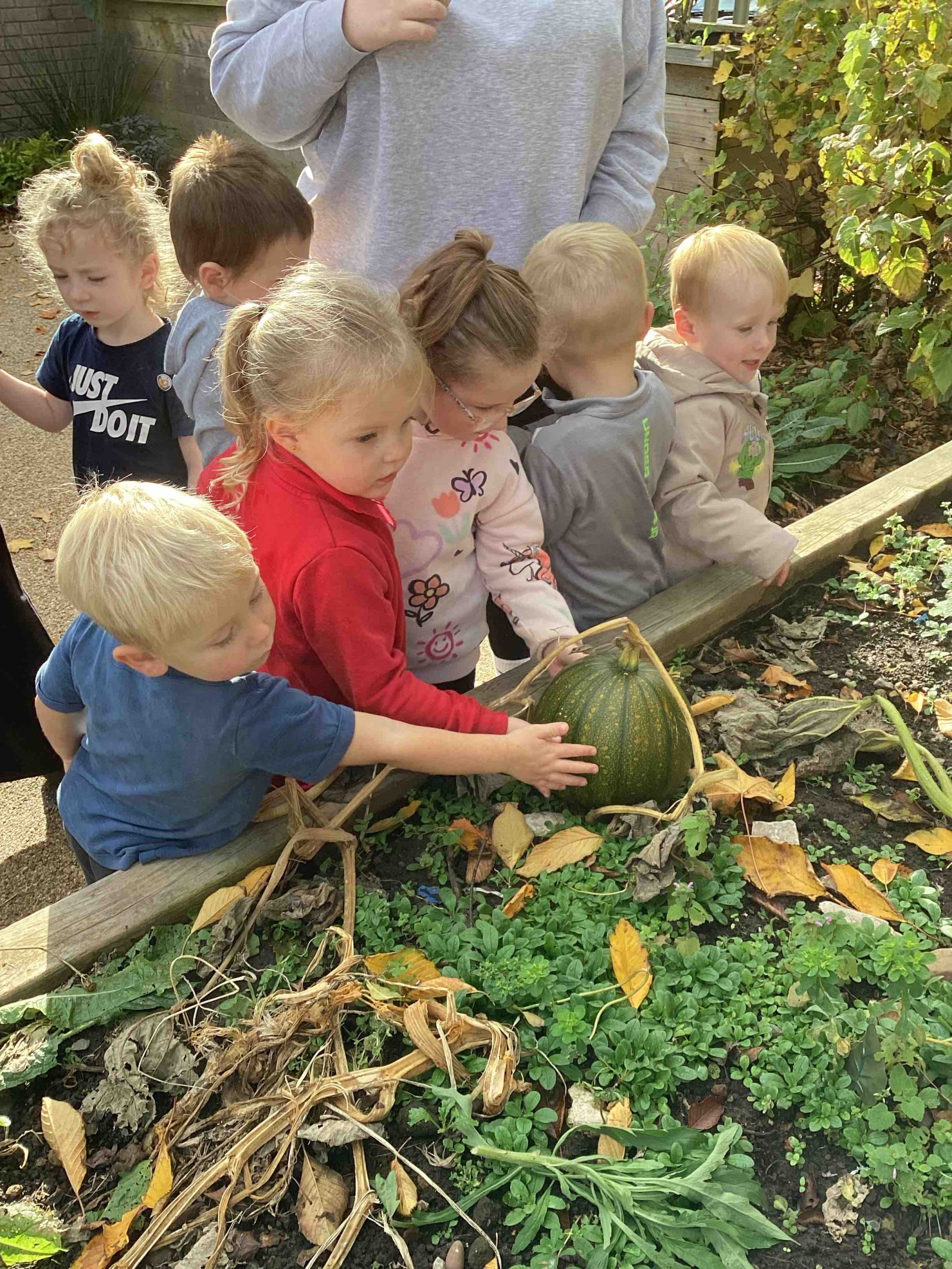 We were very busy learning ‘All about me’. The children have learnt how to draw pictures of their faces by looking in a mirror and talking about what they could see on their face and what each part was used for and then representing their faces onto the paper. The parents sent in photographs of their child as a baby and the children enjoyed talking to us all about how they have changed since being a baby and what they can do now that they couldn’t do as a baby. The children had to chose from a selection of photographs of babies which one was them and tell us how they knew it was them. As the children loved their baby photos so much we then asked the parents to send in photos of their families/ who lives in their house and the children loved telling everyone all about the people in the photographs and what they like to do at home. The children progressed their art skills from drawing faces to drawing people pictures to represent each person in their family. The photographs are displayed in nursery and the children loved practising their oracy skills talking to each other about their families. Some children started bringing in conkers and Autumn leaves so we also learnt about the season of Autumn and went to on a few Autumn walks looking for signs of Autumn, we talked about how the weather is changing and we needed to wear our coats to stay warm and dry. The children also developed their art and DT skills to create a wonderful Autumn display in nursery using lots of different techniques. We also learnt about Halloween and Diwali and the children shared how they celebrate these festivals at home. We enjoyed a visit to the pumpkin patch to see the pumpkins growing and the other foods growing in the vegetable garden.