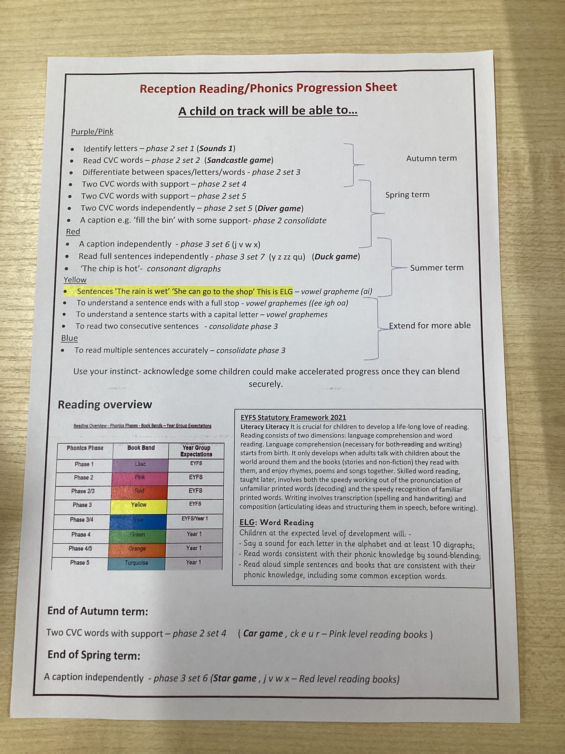 Here are the Ryelands Reception Writing Progression sheets and Ryelands Reading/ Phonics Progression sheets. These show the steps that a child will go through in order to meet (or exceed) the Early Learning Goals in Reading and Writing at the end of Reception. It is also clear to see what is expected throughout each term.
